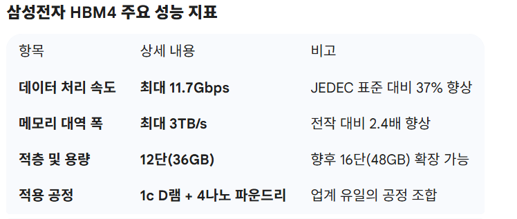 또한 삼성전자 HBM4는 단일 스택(묶음) 기준 메모리 대역 폭이 전작 대비 2.4배 향상된 최대 3TB/s 수준에 이르며, 12단 적층 기술로 최대 36GB의 용량을 제공합니다.
