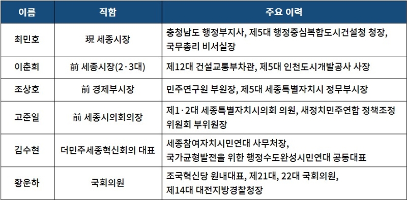 아시아경제 등 지역 언론에 따르면 ▲최민호 현 시장 ▲이춘희 전 시장 ▲조상호 전 경제부시장 ▲고준일 전 세종시의회 의장 ▲김수현 더민주세종혁신회의 대표 ▲황운하 국회의원 등이 세종시장 후보로 거론되고 있습니다.