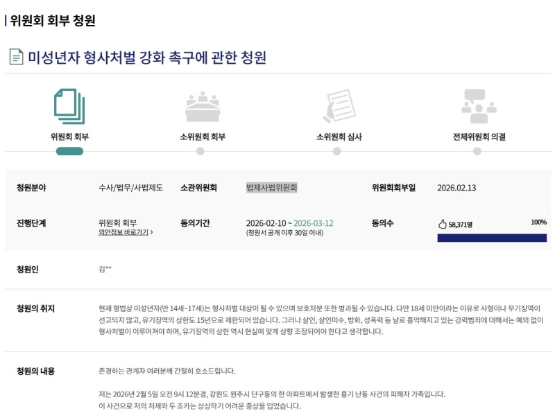14일 국회전자청원의 국민동의청원에 따르면 현재 동의 수는 5만 8천 명을 넘어섰으며, 이에 따라 해당 청원은 국회 법제사법위원회에 정식 회부되어 입법 논의 단계를 밟게 되었습니다.