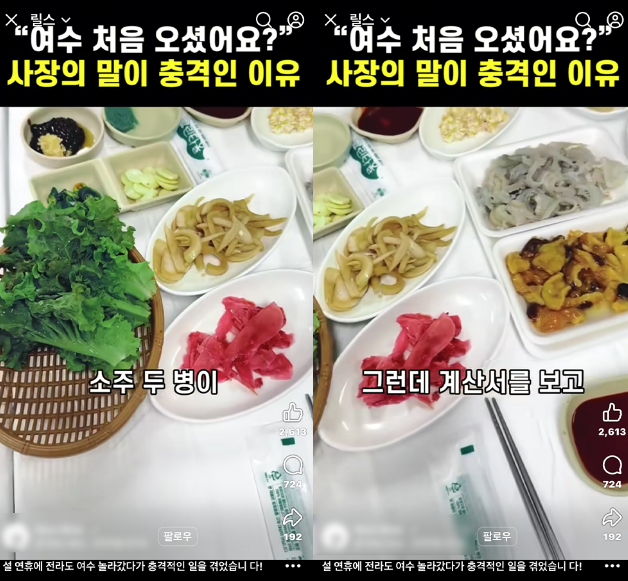 해당 영상에는 여수의 한 해산물 포장마차에서 모둠 해산물 가격이 28만 원에 달했고, 평소 7만 원 수준이던 숙소가 설 연휴를 이유로 25만 원까지 올랐다는 주장이 담겼습니다.