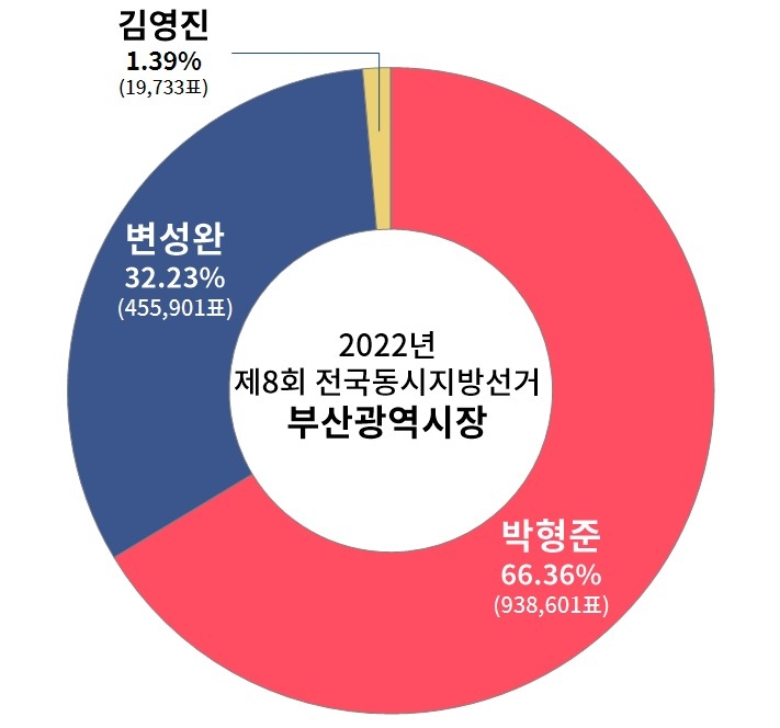 총 투표율 49.10%를 기록했던 2022년 제8회 전국동시지방선거 부산광역시장 선거에서 국민의힘 박형준 후보가 93만 8,601표(득표율 66.36%)를 얻어 당선됐습니다.