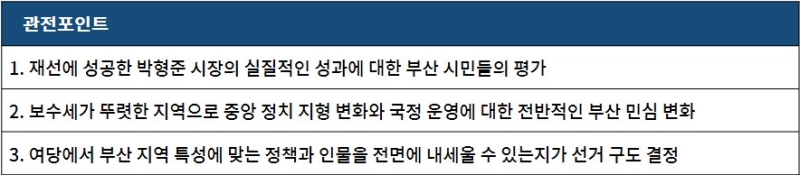 이번 부산시장 선거의 관전 포인트는 크게 세 가지로 압축됩니다.