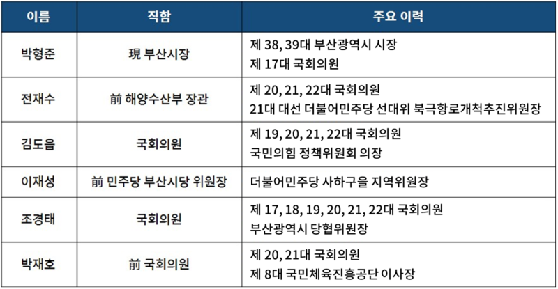 여러 지역 언론에 따르면 ▲박형준 부산시장 ▲전재수 전 해양수산부 장관/국회의원 ▲김도읍 국민의힘 국회의원 ▲이재성 전 민주당 부산시당위원장 ▲조경태 국민의힘 국회의원 ▲박재호 전 민주당 국회의원 등이 출마 예정자로 거론되고 있습니다.