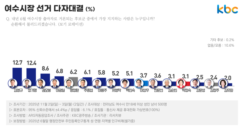 또 △백인숙 여수시의회 의장 5.5% △김창주 전 여수경영인협회 회장 5.4% △이광일 현 전남도의회 부의장 5.2% △한문선 현 여수상공회의소 회장 4.8% △이용주 전 국회의원 4.0% △김희택 현 국민의힘 여수을 당협위원장 4.0% △이상우 현 조국혁신당 여수시 지역위원장 3.4% △김유화 전 여수시도시관리공단 이사장 2.5% △서수형 현 진보당 여수시 지역위원장 1.8% △김순빈 전 여수시의회 부의장 1.8%로 나타났습니다.