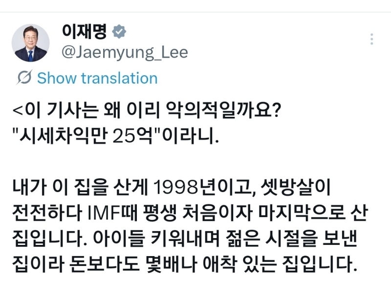 이재명 대통령이 일부 언론에서 '이 대통령이 내놓은 분당 아파트에 대해 매매 가계약이 이뤄졌고 시세차익은 25억 원 가량'이라는 취지로 보도한 것에 대해 "왜 이렇게 악의적인가"라고 반박했습니다.