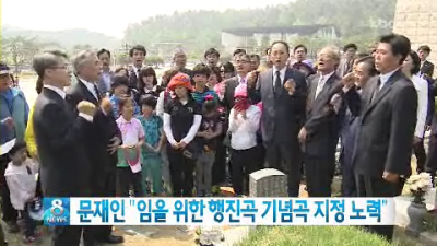 광주를 방문한 문재인 민주당 의원이 임을 위한 행진곡을 공식 기념곡으로 지정하도록 하겠다고 밝혔습니다. 문재인 의원은 오늘 오전 국립 5.18 민주 묘지를 참배한 뒤 박근혜 정부에서도 임을 위한 행진곡 논란이 되풀이돼 참담한 생각이 든다며, 논란 종식을 위해 임을 위한 행진곡을 아예 5.18 공식 기념곡으로 지정하도록 국회차원에서 나서겠다고 밝혔습니다. 문 의원의 광주방문은 대선 패배 직후인 지난해 연말 5*18 묘역을 찾은지 4개월 만입니다.