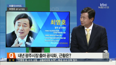 【 앵커멘트 】남> 피플인사이드, 오늘은 최영호 광주 남구청장과 함께 합니다. Q1. 내년 광주시장 선거에 사실상 출마 입장을 밝히고 난 후, 많이 바쁘실 것 같은데 ? Q2. ‘세대 교체’,‘젊은 광주’를 강조하던데.. 그 부분을 강조하는 이유가 궁금합니다. Q3. 문재인 대통령이 지방분권을 강조하고 있는데.. 내년 지방선거 어떻게 보십니까? ▶VCR3> 문재인 정부 / 남구청장 관련 영상 Q4. 내년이 ‘전라도’라는 명칭이 생겨난 지 천년이 되는 해입니다. 지나온 천년도 중요하지만 앞으로의 천년은 더욱 중요한 부분인데,
