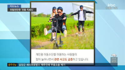 【 앵커멘트 】 요즘 전동 킥보드와 같은 개인용 이동수단을 탄 사람들을 어렵지 않게 볼 수 있는데요. 학생과 직장인, 어린이 등 누구나 쉽게 이용하고 있지만, 안전사고 위험에는 무방비로 노출된 상황입니다. 【 기자 】 #1. 전동 휠이나 전동 킥보드, 자전거 등 전기 동력으로 움직이는 개인용 이동수단. 간편한 사용법과 휴대성이 좋아 젊은 층에서 큰 인기를 끌고 있는데요. #2. 이를 이용하는 사람들이 점차 늘어나면서 관련 사고도 급증하고 있습니다. #3. 최근 3년간, 사고 건수를 살펴보면 2014년엔 40건에서 2