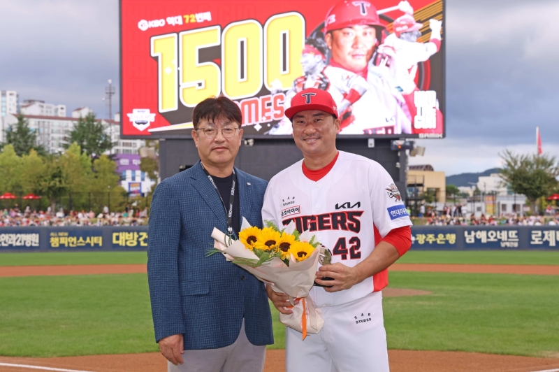 KIA는 4일 광주-KIA 챔피언스필드에서 열리는 삼성 라이온즈와의 정규리그 마지막 경기에 앞서 김태군 1,500경기 출장 달성 시상식을 열었습니다.