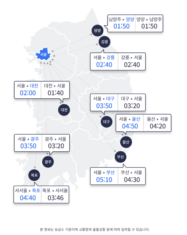 한국도로공사에 따르면 밤 9시 기준 요금소 출발 기준 승용차로 서울에서 주요 도시까지 △부산 5시간10분 △울산 4시간50분 △대구 3시간50분 △광주 3시간50분 △강릉 2시간40분 △대전 2시간10분 소요될 것으로 보입니다.