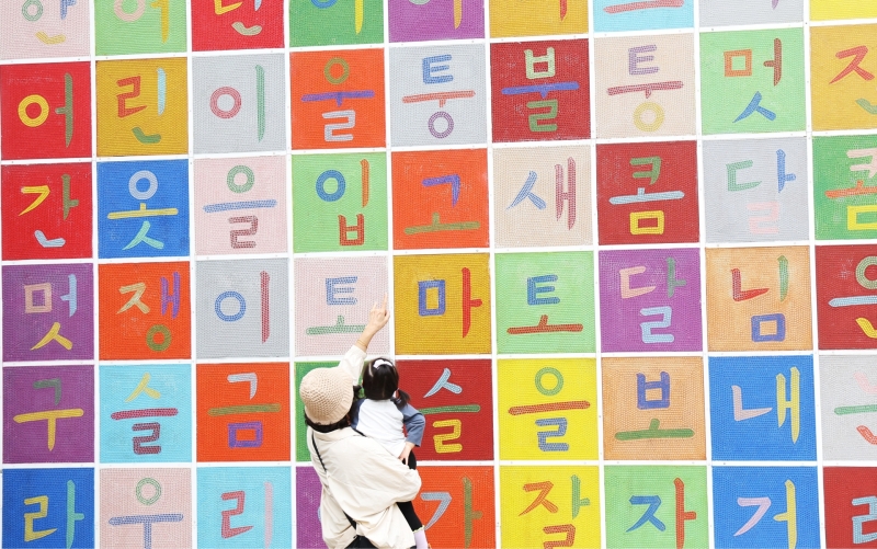 ▲ 한글날을 하루 앞둔 8일 경기도 용인시 기흥구 경기도어린이박물관을 찾은 어린이가 한글 벽화를 바라보고 있다. [연합뉴스]