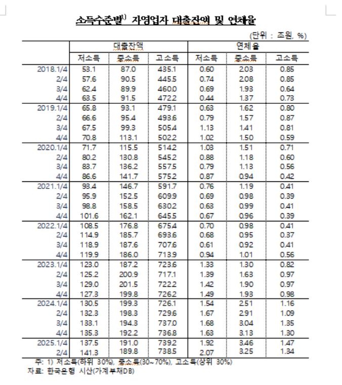 특히 영세 저소득 자영업자의 연체율은 12년 만에 최고 수준까지 치솟았다. 한국은행도 이런 자영업 취약 대출자를 전체 경제의 뇌관으로 지목하고 집중적 정책 지원 필요성을 강조하고 있습니다.