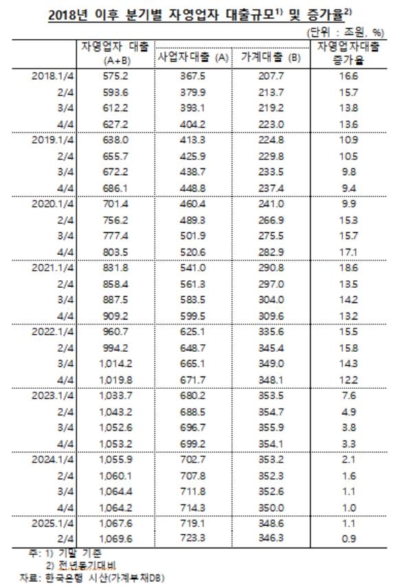 12일 한국은행이 국회 행정안전위원회 양부남 의원(더불어민주당)·기획재정위원회 박성훈 의원(국민의힘)에게 제출한 '자영업자 대출 현황' 자료에 따르면 올해 2분기(기말 기준) 자영업자의 전체 금융기관 대출 잔액은 1천69조6천억원으로 추산됐습니다.