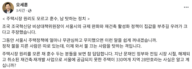 조국 조국혁신당 비상대책위원장이 "오세훈 시장은 서울시장이 아닌 '강남시장'을 자처하고 있다"고 비판하자, 오세훈 서울시장이 "주택시장 원리도 모르고 훈수한다"고 맞받았습니다.