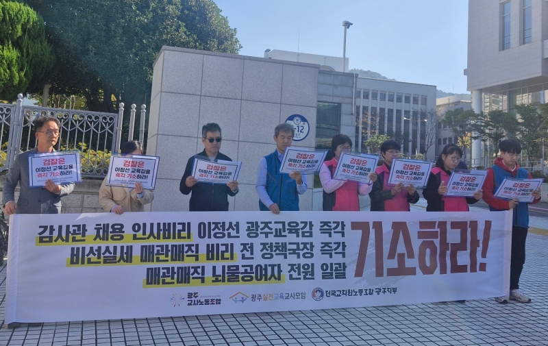 광주교사노조와 광주실천교육교사모임, 전교조 광주지부는 20일 오전 광주지검 앞에서 기자회견을 열고, "이정선 광주교육감의 취임과 동시에 빚어진 '교육감 친구 감사관 채용비리'가 임기 종료 1년도 남지 않은 오늘까지 정리되지 않고 있다"며 "검찰은 망설이지 말고 이정선 광주교육감을 즉각 기소하라"고 요구했습니다.