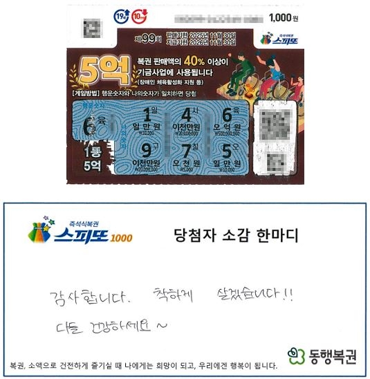 23일 동행복권 공식 홈페이지에 올라온 '스피또1000' 99회차 1등 당첨자의 소감을 보면, A씨는 홀로 제주 여행 중 우연히 보게 된 한 복권 판매점에서 스피또1000 1만 원어치를 구매했습니다.
