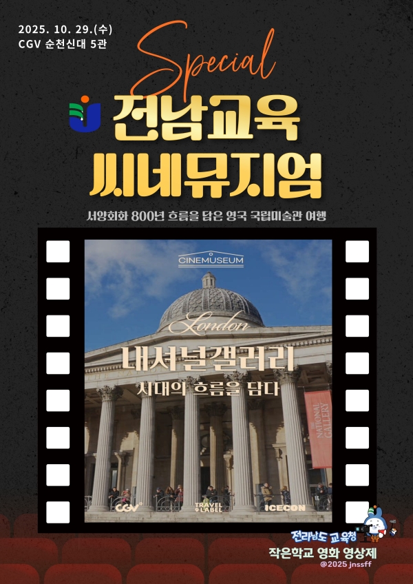 전남교육씨네뮤지엄은 CJ CGV ICECON의 '씨네뮤지엄'을 전남교육청 맞춤형 인문학 교육 콘텐츠로 재구성한 것으로, '내셔널 갤러리, 시대의 흐름을 담다'라는 주제 아래 유럽 미술의 역사와 예술가들의 삶, 문화적 배경을 인문학적 시각으로 조명합니다.