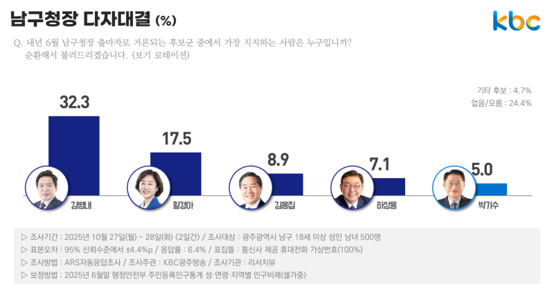 김병내 32.3% 오차범위 밖 1위...황경아 17.5%[KBC 광주 남구청장 여론조사]
