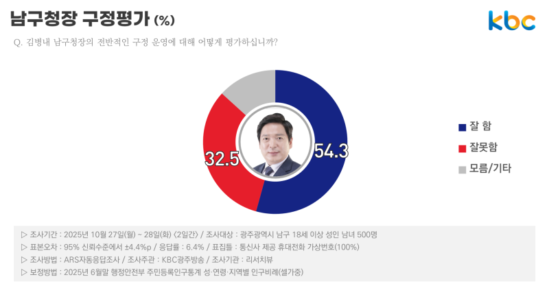 남구청장 직무평가 긍정 54.3%, 부정 32.5%
