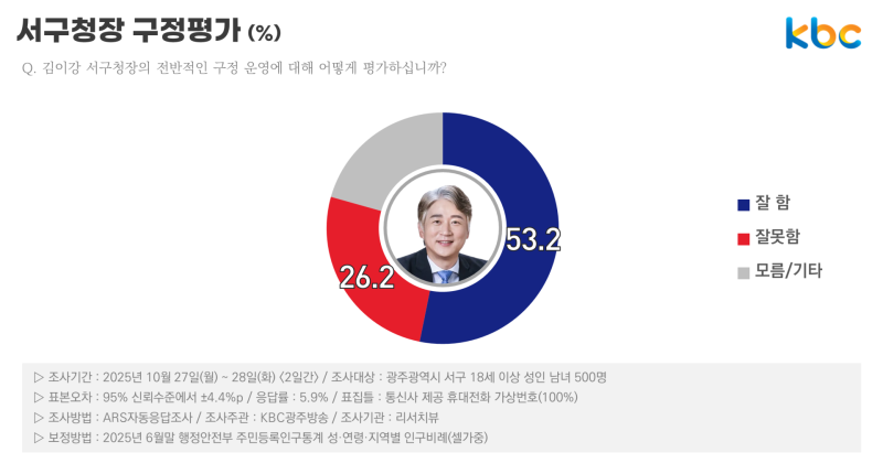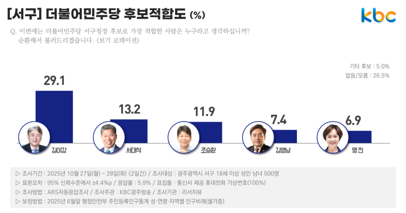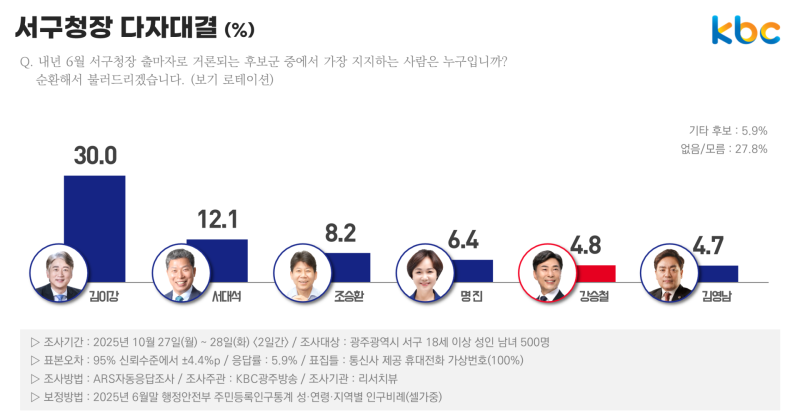 KBC 광주방송이 여론조사 전문기관 리서치뷰에 의뢰해 지난 27~28일 광주 서구 거주 만 18세 이상 유권자 500명을 대상으로 후보 지지도를 조사한 결과, 김이강 청장이 30.0% 지지율로 12.1%를 기록한 서대석 전 청장을 앞섰습니다.