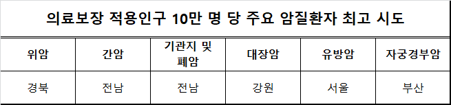 대장암 320명, 기관지 및 폐암 263명 등의 순이었고 간암은 10만 명당 159명, 자궁경부암은 98명으로 조사됐습니다.