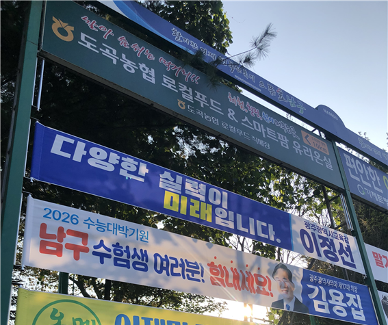 지역 시민단체가 이정선 광주광역시교육감이 내건 홍보 현수막에 대해 공직선거법 위반 의혹을 제기하며, 선관위의 철저한 조사를 촉구했습니다.