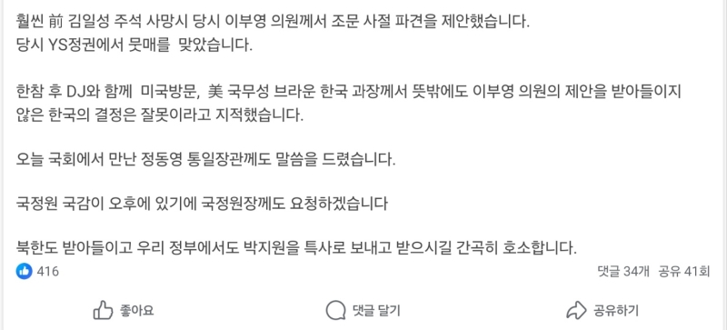 이어 "여건이 허락한다면 제가 김영남 위원장 조문 사절로 평양을 방문하겠다"며 "과거 김대중 대통령 서거 때 북한에서 김기남 비서 등 조문 사절단이 오셨다. 김정일 위원장 조문 사절로 이희호 여사께서 다녀오셨다. 훨씬 前 김일성 주석 사망 당시 이부영 의원께서 조문 사절 파견을 제안했다. 당시 YS정권에서 뭇매를 맞았다"고 말했습니다.