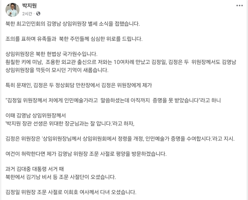 박 의원은 4일 오후 SNS를 통해 김영남 전 북한 최고인민회의 상임위원장의 별세 소식을 짧게 언급한 뒤, 조문을 위해 평양에 다녀오고 싶다고 밝혔습니다.