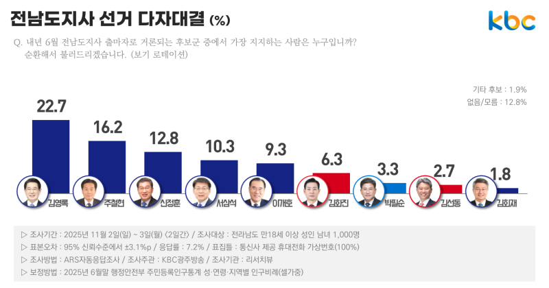 차기 전남도지사 선거에서 현직인 김영록 지사가 가장 높은 지지도를 기록했습니다. 이어 다선 국회의원인 주철현·신정훈·서삼석 의원은 오차범위 내에서 각축전을 벌였습니다.
