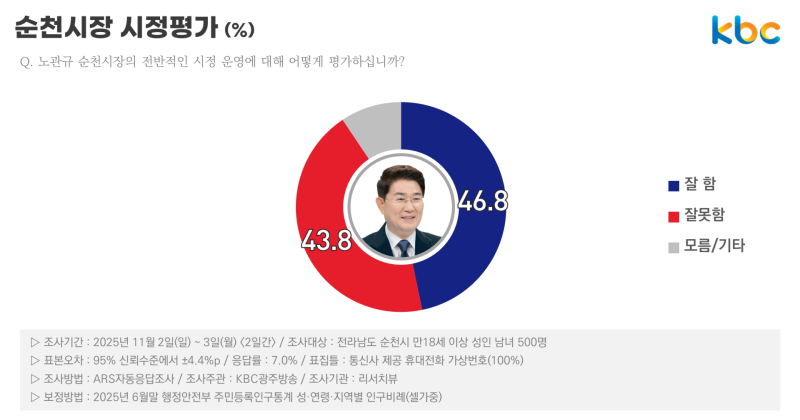 KBC 광주방송이 여론조사 전문기관 리서치뷰에 의뢰해 지난 2~3일 이틀간 순천에 거주하는 만 18살 이상 유권자 500명을 대상으로 여론조사를 실시한 결과 노관규 시장이 21.7%로 가장 높은 지지율을 보였습니다.