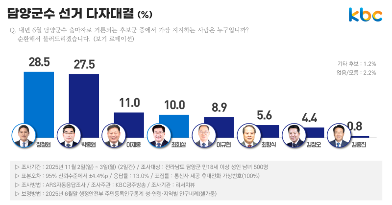 KBC 광주방송이 여론조사 전문기관 리서치뷰에 의뢰해 지난 2~3일 이틀간 전라남도 담양군 거주 만 18세 이상 유권자 500명을 대상으로 담양군수 후보군 중 가장 지지하는 사람을 물은 결과 정철원 현 담양군수가 28.5%, 박종원 현 전남도의원이 27.5%의 지지를 얻은 것으로 조사됐습니다.