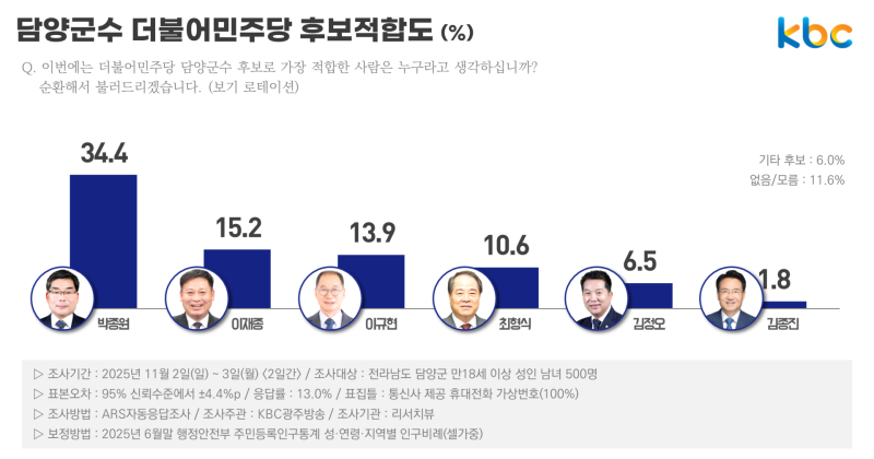 더불어민주당 담양군수 후보적합도에서는 박종원 현 전남도의원이 34.4%의 지지를 얻으며 나머지 후보들을 오차범위 밖에서 앞섰습니다.