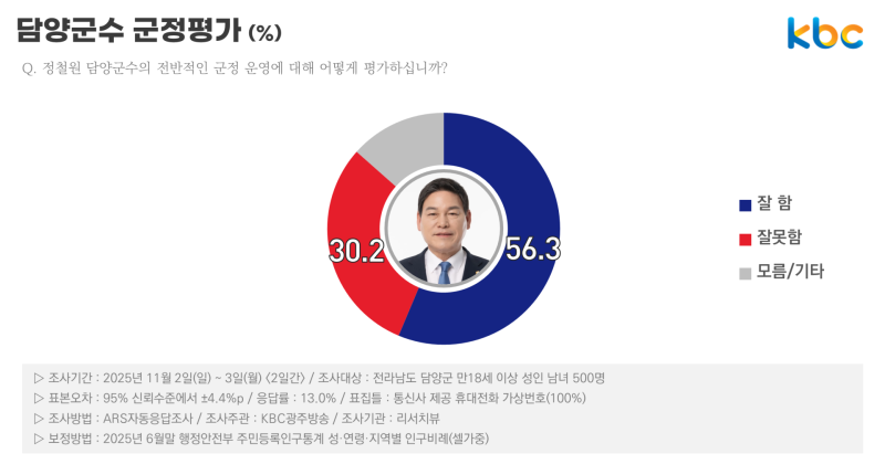 전국 유일의 조국혁신당 소속인 정철원 담양군수의 전반적인 군정 운영에 대해서는 △잘함 56.3%(매우 잘함 27.1%, 잘함 29.2%) △잘못함 30.2%(잘못함 17.5%, 매우 잘못함 12.7%)로, 긍정률이 부정률보다 1.9배 높았습니다.