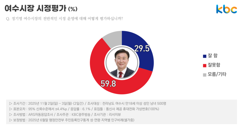 정기명 여수시장의 전반적인 시정 운영에 대해선 △잘함 29.5%(매우 잘함 10.0%, 잘함 19.5%) △잘못함 59.8%(잘못함 26.1%, 매우 잘못함 33.7%)로 부정 평가가 2배 넘게 높았습니다.