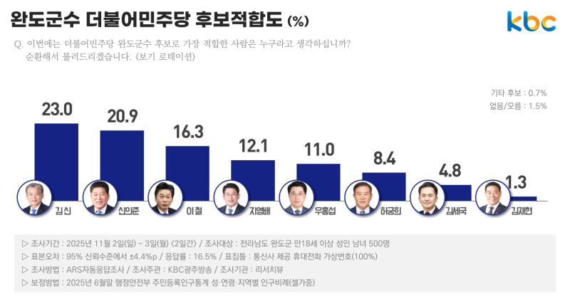 KBC 광주방송이 여론조사 전문기관 리서치뷰에 의뢰해 지난 2~3일 이틀간 전라남도 완도군 거주 만 18세 이상 유권자 500명을 대상으로 완도군수 후보군 중 가장 지지하는 사람을 물은 결과 김신 전 완도군의원이 23.9%, 신의준 현 전남도의원이 22.0%의 지지를 얻는 등 오차범위 내인 1.9%p 차이를 보이며 치열한 선두다툼을 벌였습니다.