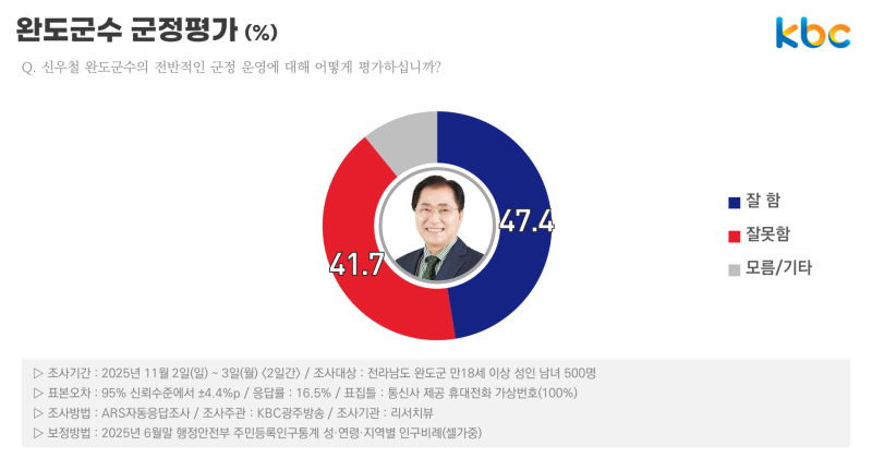 신우철 완도군수의 전반적인 군정 운영에 대해서는 △잘함 47.4%(매우 잘함 17.2%, 잘함 30.3%) △잘못함 41.7%(잘못함 24.5%, 매우 잘못함 17.2%)로, 긍정 평가가 오차범위 내인 5.7%p 높았습니다.