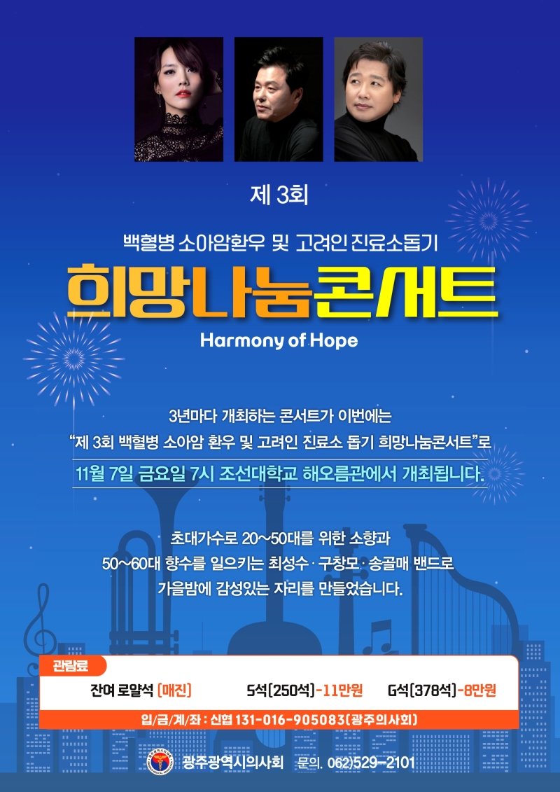 백혈병 소아암 환우 및 고려인 진료소를 돕기 위한 '제3회 희망나눔콘서트(Harmony of Hope)'가 7일 저녁 7시 조선대학교 해오름관에서 막을 올립니다.
