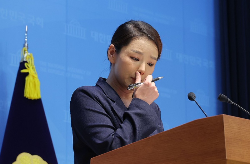 ▲ 지난 9월 4일, 조국혁신당 강미정 대변인이 당내 성비위 의혹과 관련한 탈당 기자회견을 하고 있다 [연합뉴스]