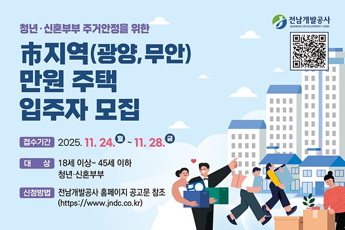 모집 일정은 △(11월 말) 입주신청서 접수 △(12월) 입주자격 검증 △(26년 1월) 입주자 추첨 및 입주 순으로 이어지며, 자세한 사항은 전남개발공사 홈페이지(https://www.jndc.co.kr)에서 확인할 수 있습니다.