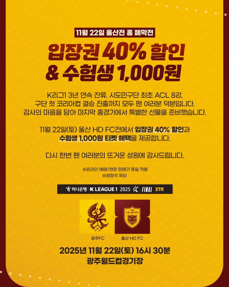 광주는 22일 광주월드컵경기장에서 열리는 하나은행 K리그1 2025 37라운드 울산HD FC전 홈 폐막전을 기념해 전 좌석 40% 할인(원정석 제외)을 실시합니다.