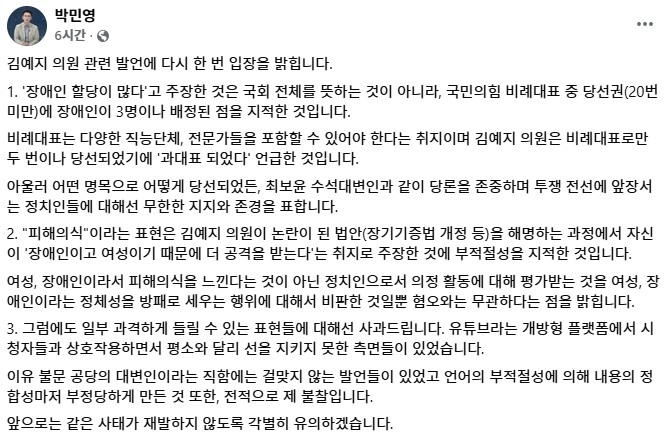 논란이 일자 박 대변인은 이날 오전 자신의 페이스북에 "과격하게 들릴 수 있는 표현에 대해선 사과드린다"면서도 "국민의힘의 20번 미만 비례대표 당선권에서 장애인이 3명이나 배정된 점을 지적한 것"이라고 주장했습니다.