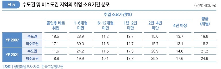 구체적으로 최근 수도권 거주 청년은 취업까지 21.2개월이 걸린 반면, 비수도권 청년은 24.6개월이 걸려 3.4개월의 격차를 보였습니다.