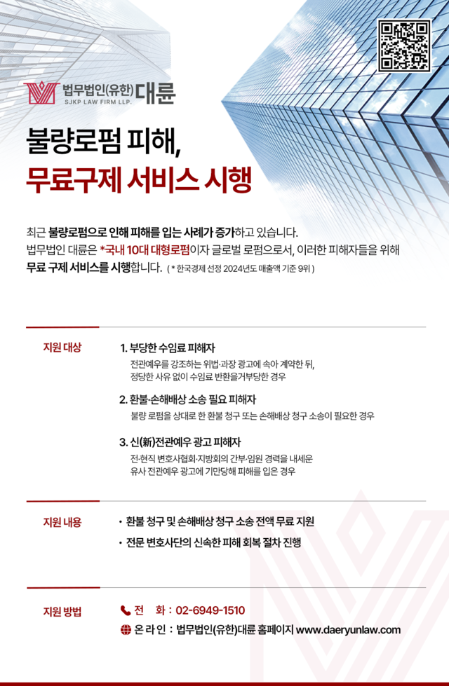 최근 불량로펌 피해자들이 늘어나고 있는 가운데, 국내 10대 대형로펌(대형 언론사 선정 공표 2024년 매출액 기준)이자 글로벌 로펌인 법무법인 대륜이 피해자들을 대상으로 한 무료 구제 서비스를 시행합니다.