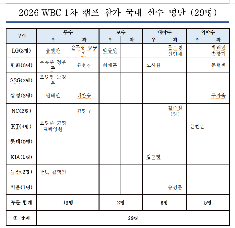 KBO는 3일 "강화위원회가 2026 WBC 1차 캠프에 참가할 국내 선수 명단을 확정했다"며 "1차 캠프는 투수 16명, 야수 13명으로 구성했다"고 밝혔습니다.
