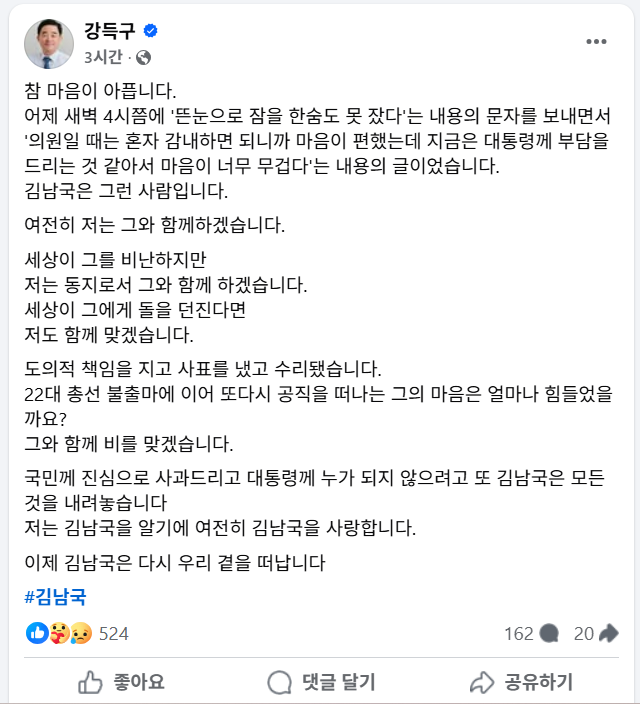 강 의원은 "김남국은 그런 사람"이라며 "세상이 그를 비난하지만 동지로서 그와 함께하겠다. 세상이 그에게 돌을 던진다면 저도 함께 맞겠다"며 동지애를 드러냈습니다.