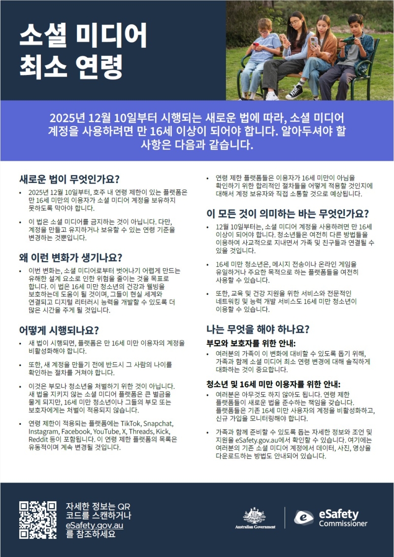 호주는 지난해 말 16세 미만 이용자의 계정 보유를 막기 위해 합리적인 조치를 취하지 않는 소셜미디어 플랫폼에 최대 4,950만 호주달러(약 485억 원)의 벌금을 부과하는 관련 법을 통과시켰습니다.