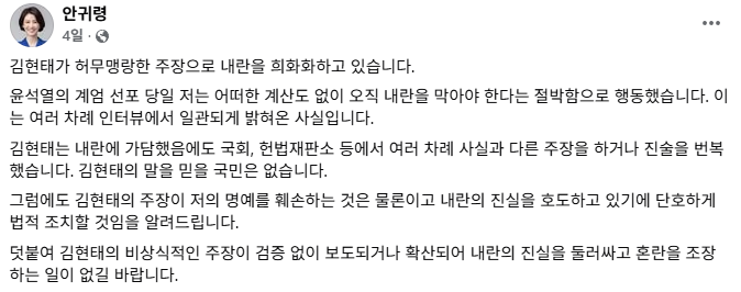 안 부대변인은 윤석열 전 대통령의 계엄 선포 당일 어떤 계산도 없이 내란을 막아야 한다는 절박함으로 행동했으며, 김 전 단장의 주장은 자신의 명예를 훼손하는 것은 물론 내란의 진실을 호도하고 있어 단호하게 법적 조치할 것임을 예고했습니다.