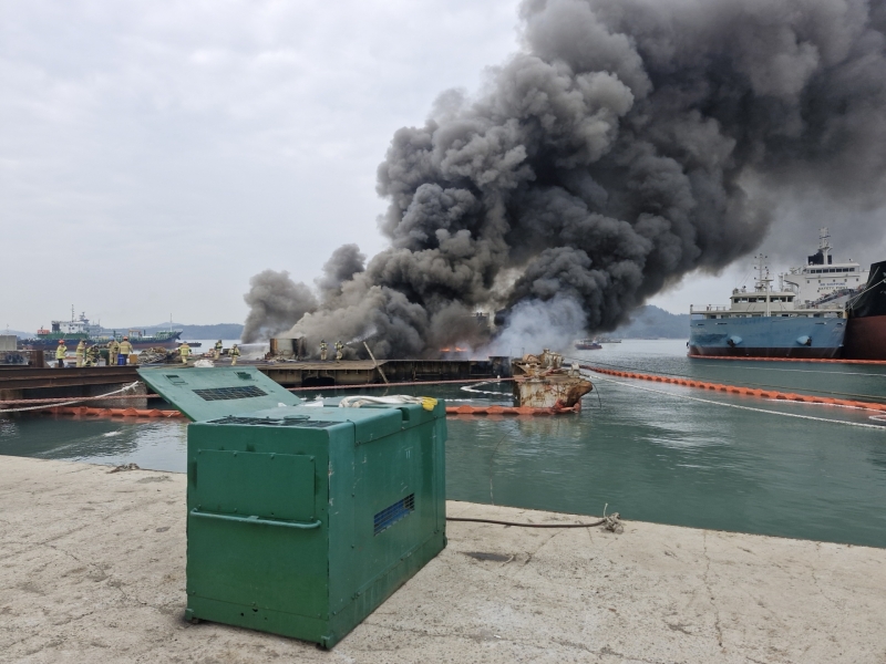 이 불로 수리 작업장 인근에 있던 작업자 20여 명이 대피하고, 배 뒷부분 갑판과 기관실이 탔습니다.