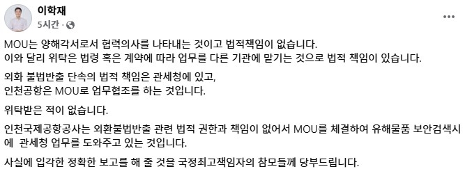 이 사장은 17일 페이스북에 "외화 불법반출 단속의 법적 책임은 관세청에 있고, 인천공항은 업무협약(MOU)으로 협조하는 것"이라고 주장했습니다.