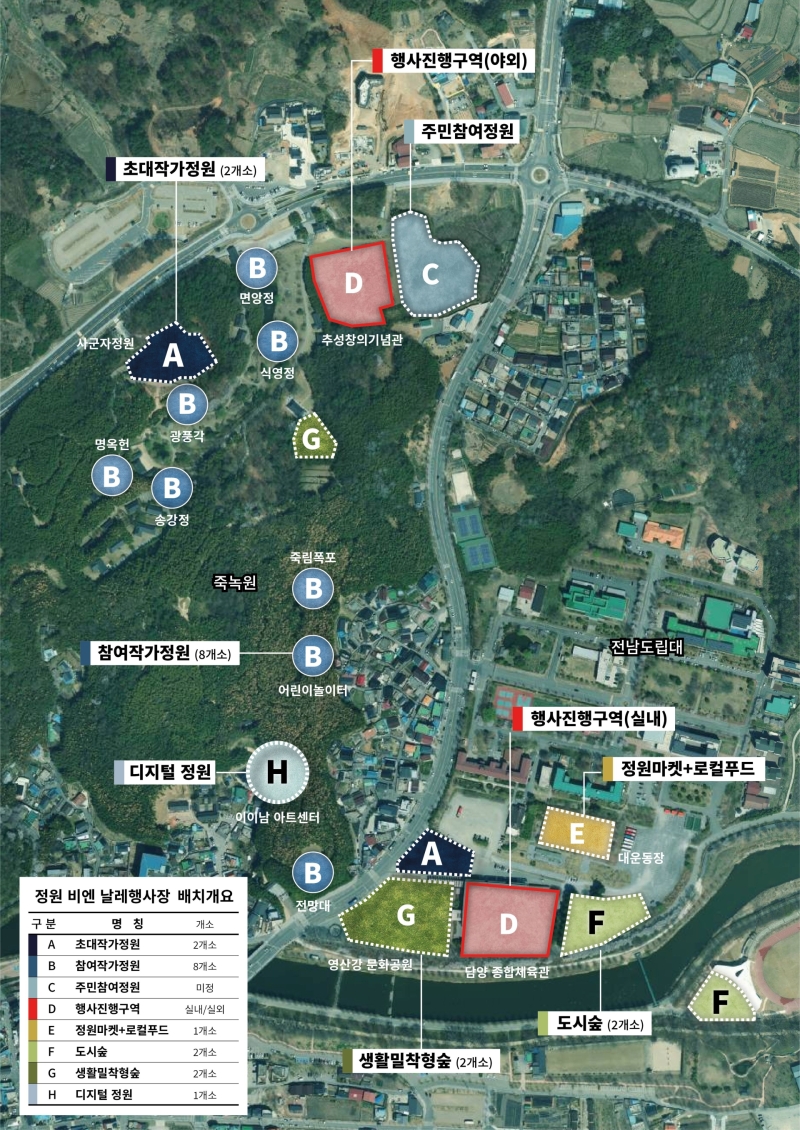 호남의 3대 정원인 소쇄원과 가사문학의 본고장으로 남도의 정원을 잘 담을 수 있는 담양군 죽녹원과 관방제림, 국립정원문화원을 메인으로 구례 지리산 지방정원, 민간정원 30개소 등 22개 시군 정원 곳곳까지 확장해 개최될 계획입니다.